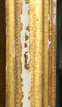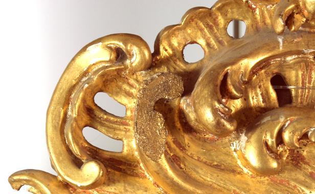 Vorzustand - Einzelne Fehlstellen in der Laubschnitzerei - zahlreiche Fassungsabhebungen und –ausbrüche - partienweise Abriebe der Goldschicht - mehrere ältere nachgedunkelte Bronzeretuschen - flächige aufliegende Schmutzschicht |