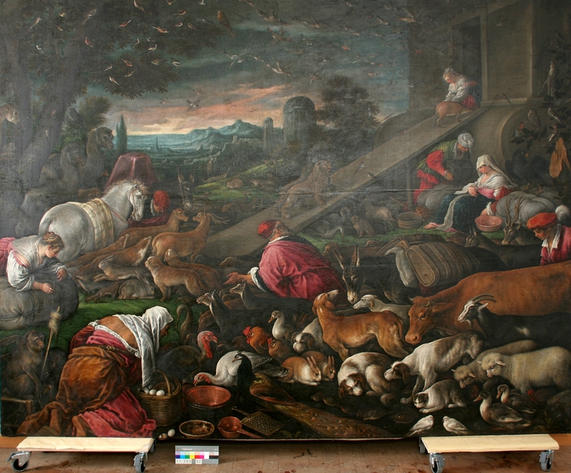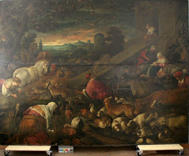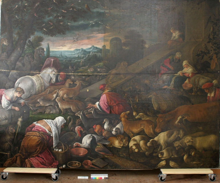 Vorzustand - Ältere Doublierung in den Randbereichen tlw. gelöst - Keilrahmen tlw. beschädigt und dadurch nicht mehr ausreichend stabil - Nicht originale Firnis stark vergilbt und getrübt. - Mehrere verfärbte Retuschen zum Teil über der originalen Malerei liegend - Einzelne kleinere Fehlstellen in der Malerei - flächig aufliegende Schmutzschicht |