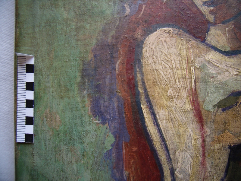 Vorzustand - Flächige aufliegende Schmutzschicht - Durchhängender Bildträger aufgrund einer mangelhaften Aufspannung |